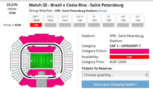 1). На официальном сайте FIFA сейчас работает раздел Last minute sale. Периодически в нём появляются билеты на разные матчи. Правда разбирают их за считанные минуты. Корреспондент «Открытых медиа» попробовал приобрести билет вечером 5 июня. Сайт предложил ему два матча: Бразилия — Коста-Рика (22 июня, Санкт-Петербург) и Тунис — Англия (18 июня, Волгоград). На игру американцев можно было купить билет первой, лучшей категории за 12 600 рублей, на игру англичан были самые дешевые билеты по 1 260 рублей. Впрочем, за те пару минут, что корреспондент «Открытых медиа» потратил на выбор матча, билетов в продаже не осталось.