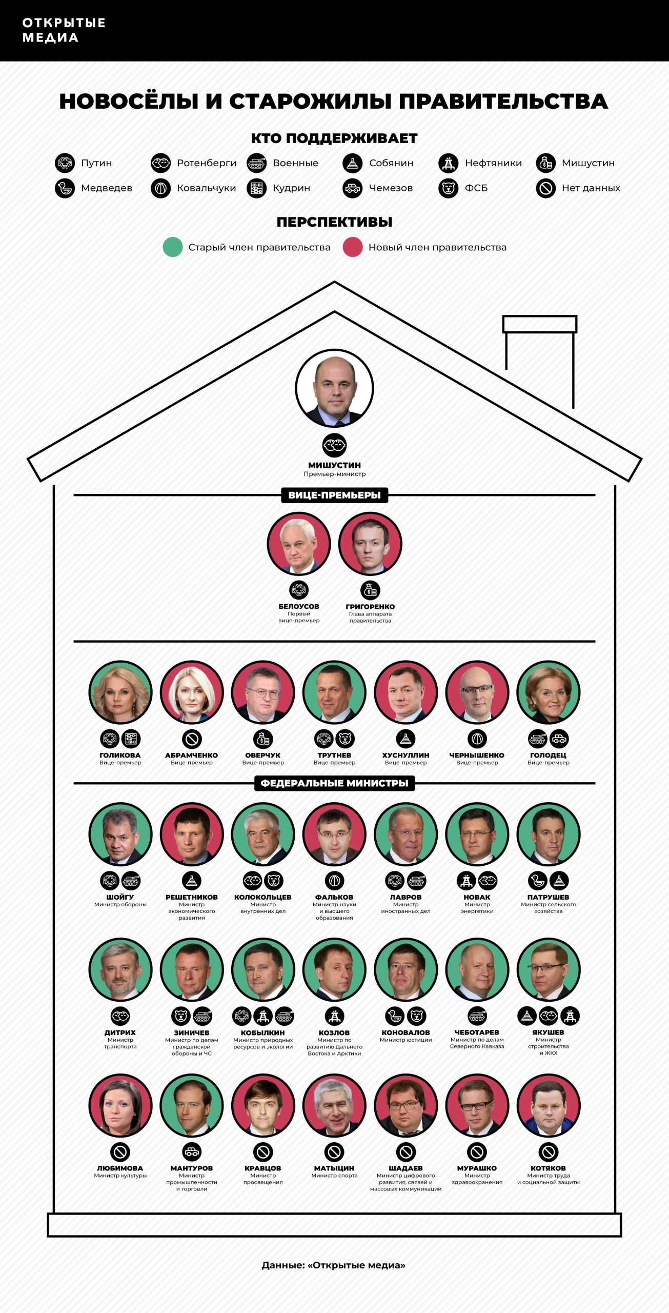 По словам источников «Открытых медиа», также усилили свои позиции давние знакомые Владимира Путина братья Ковальчуки, которые поддерживают нового вице-премьера Дмитрия Чернышенко и министра науки и высшего образования Валерия Фалькова. При этом Чернышенко — креатура кремлёвского куратора СМИ, первого замглавы администрации президента Алексея Громова. Тот возглавлял медиа-обеспечение Олимпиады-2014, когда Чернышенко руководил её оргкомитетом.