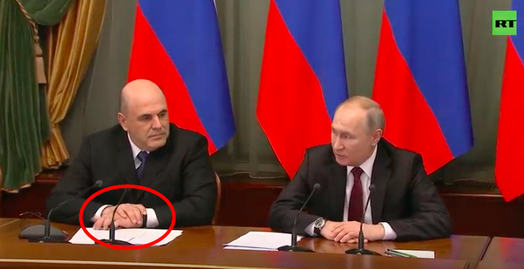 В Telegram-каналах высмеяли то, как премьер Мишустин, сидя рядом с президентом Путиным на представлении нового правительства, старательно прикрывал часы на своей руке, обращённой к главе государства.