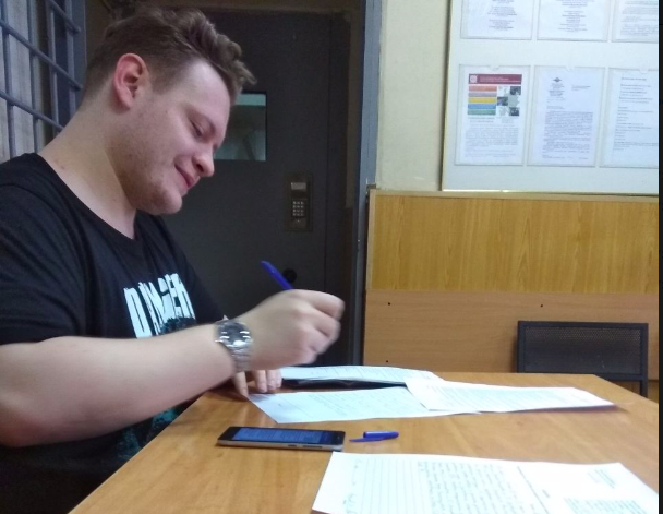 Святослав Мануйлов пишет заявление в полицию на руководство театра. Фото предоставлено профсоюзом театра.