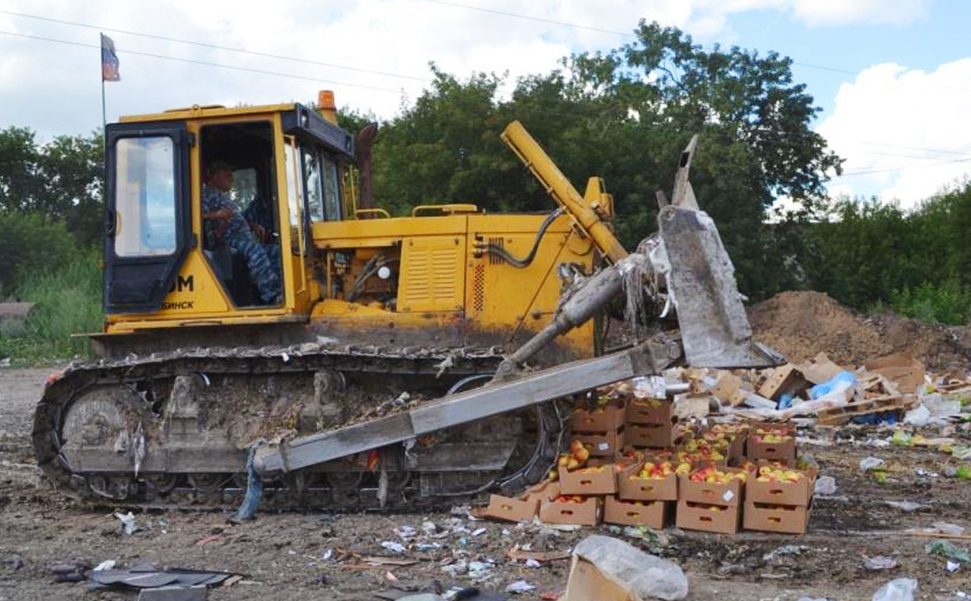 NOVOSIBIRSK REGION, RUSSIA. AUGUST 6, 2015. A bulldozer crushes illegally imported fruit at a landfill. Russia has banned certain food imports from the United States and its allies, including the EU, Norway, Canada, and Australia, in response to anti-Russian sanctions over the reintegration of Crimea into Russia. On July 29 2015, a new Russian legislation came into effect which states that illegally imported food and other agricultural products should be destroyed. Rosselkhoznadzor Press Office/TASS Ðîññèÿ. Íîâîñèáèðñêàÿ îáëàñòü. 7 àâãóñòà 2015. Óíè÷òîæåíèå ñàíêöèîííîé ïðîäóêöèè íà îäíîì èç ïîëèãîíîâ. Ñ 29 èþëÿ 2015 ãîäà âñòóïèë â ñèëó çàêîí, ïðåäóñìàòðèâàþùèé óíè÷òîæåíèå ñåëüñêîõîçÿéñòâåííîé ïðîäóêöèè, ñûðüÿ è ïðîäîâîëüñòâèÿ, êîòîðûå ââåçåíû èç ñòðàí, ïîääåðæàâøèõ àíòèðîññèéñêèå ýêîíîìè÷åñêèå ñàíêöèè. Ïðåññ-ñëóæáà Ðîññåëüõîçíàäçîðà/ÒÀÑÑ
