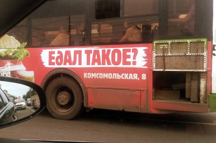 ? ФАС сегодня сочла, что в слогане на автобусе в Екатеринбурге «ЕдАЛ ТАКОЕ?» все признаки употребления русского мата. Все буквы кроме второй в первом слове — прописные, а вторая буква в слове строчная и похожа на букву «б», из-за слоган читается как матерный.