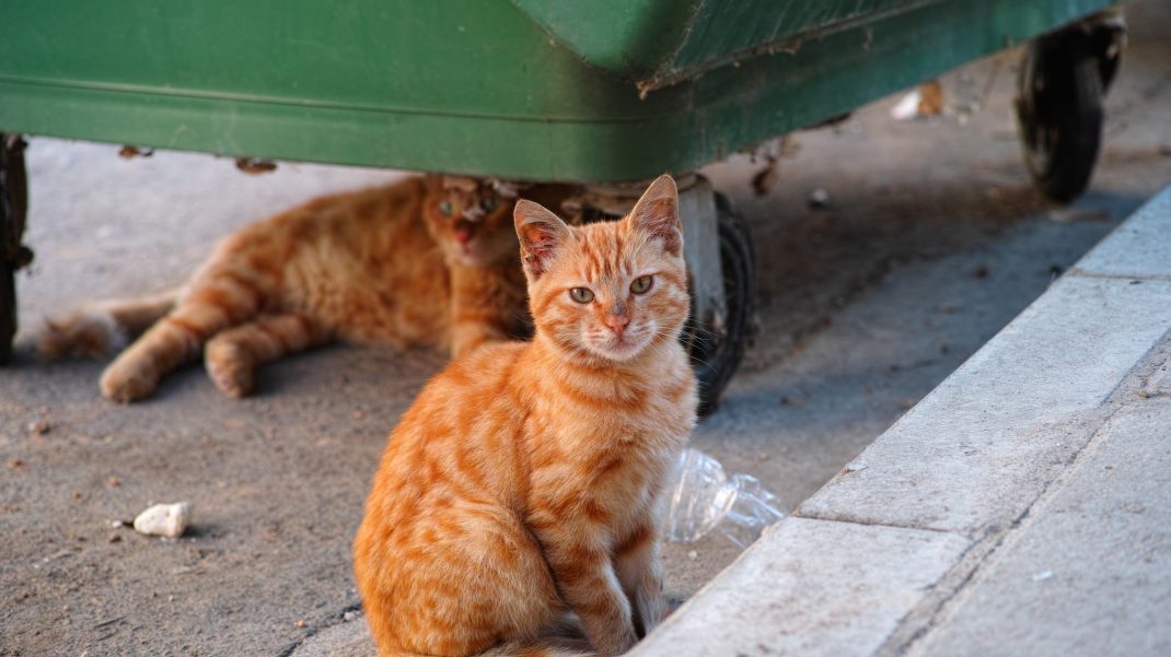 Stray cats or street cats near garbage container. One of them under the garbage container and the other one looks at the camera.