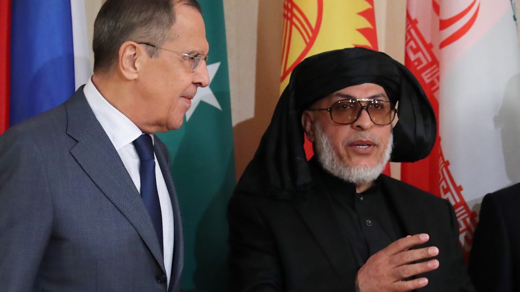 MOSCOW, RUSSIA — NOVEMBER 9, 2018: The Minister of Foreign Affairs of Russia, Sergei Lavrov (L), and Taliban political chief Sher Mohammad Abbas Stanikzai during a photo session before the second round of the Moscow format consultations on Afghanistan; the meeting is attended by deputy foreign ministers and special representatives from Afghanistan, its neighbouring countries in Central and East Asia, and the US. Sergei Savostyanov/TASS Ðîññèÿ. Ìîñêâà. Ìèíèñòð èíîñòðàííûõ äåë ÐÔ Ñåðãåé Ëàâðîâ è ðóêîâîäèòåëü Ïîëèòîôèñà ðàäèêàëüíîãî äâèæåíèÿ «Òàëèáàí» (çàïðåùåíî â ÐÔ) Øåð Ìîõàììàä Àááàñ Ñòàíàêçàé (ñëåâà íàïðàâî) âî âðåìÿ öåðåìîíèè ñîâìåñòíîãî ôîòîãðàôèðîâàíèÿ ïåðåä íà÷àëîì âòîðîãî çàñåäàíèÿ Ìîñêîâñêîãî ôîðìàòà êîíñóëüòàöèé ïî Àôãàíèñòàíó íà óðîâíå çàìåñòèòåëåé ìèíèñòðîâ èíîñòðàííûõ äåë è ñïåöïðåäñòàâèòåëåé. Ñåðãåé Ñàâîñòüÿíîâ/ÒÀÑÑ