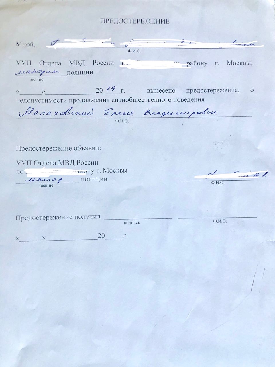 Корреспонденту «Открытых медиа» Елене Малаховской предостережение «о недопустимости продолжения антиобщественного поведения» принёс районный участковый, который сам его и составил. Сотрудник полиции не смог объяснить, на каком основании он изготовил этот документ. «На вас был составлен протокол об административном правонарушении», — сказал он.