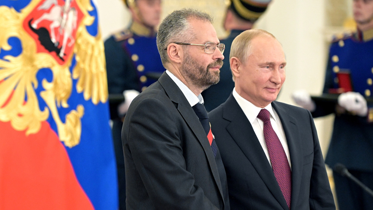Ефим Хазанов (слева) и Владимир Путин (справа) на церемонии вручения Государственных премий, 2018 год. Фото: Сергей Гунеев / РИА Новости