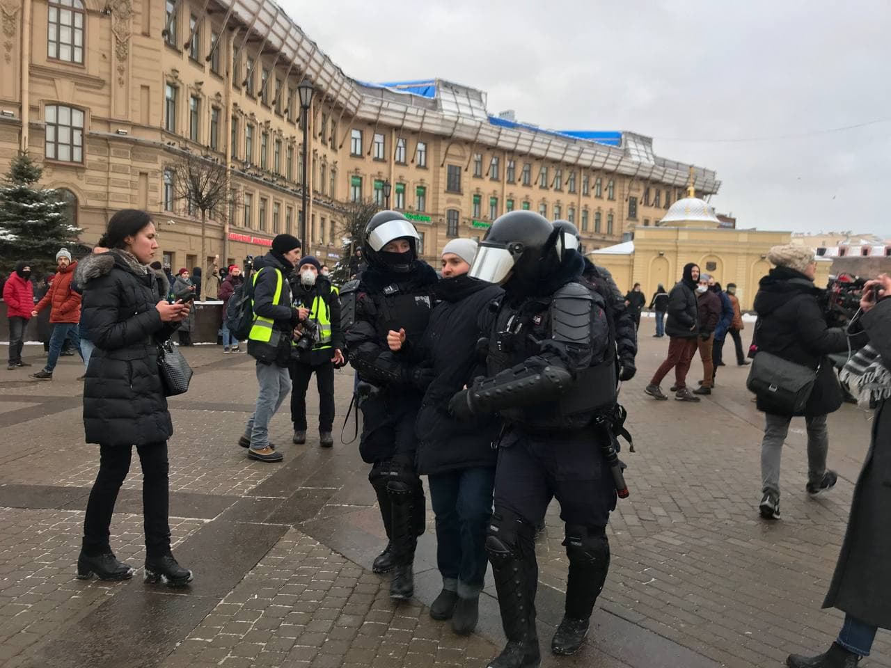 13:35. Вскоре там начались столкновения протестующих с полицией. «Фонтанка» сообщила о применении полицией слезоточивого газа для разгона протестующих. Толпа, указывает корреспондент ОМ, попыталась отбить человека, которого хотели задержать несколько омоновцев.