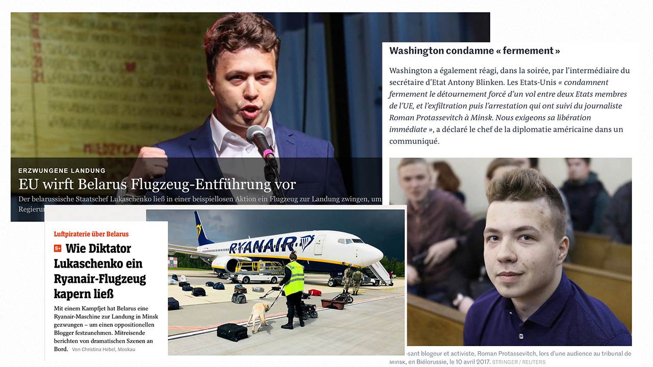 «Властный президент Белоруссии в воскресенье направил истребитель, чтобы перехватить европейский авиалайнер, пролетавший через воздушное пространство [его] страны, и приказал самолёту приземлиться в столице республики — Минске, где был задержан находившийся на борту известный оппозиционный журналист. Это вызвало возмущение международной общественности.