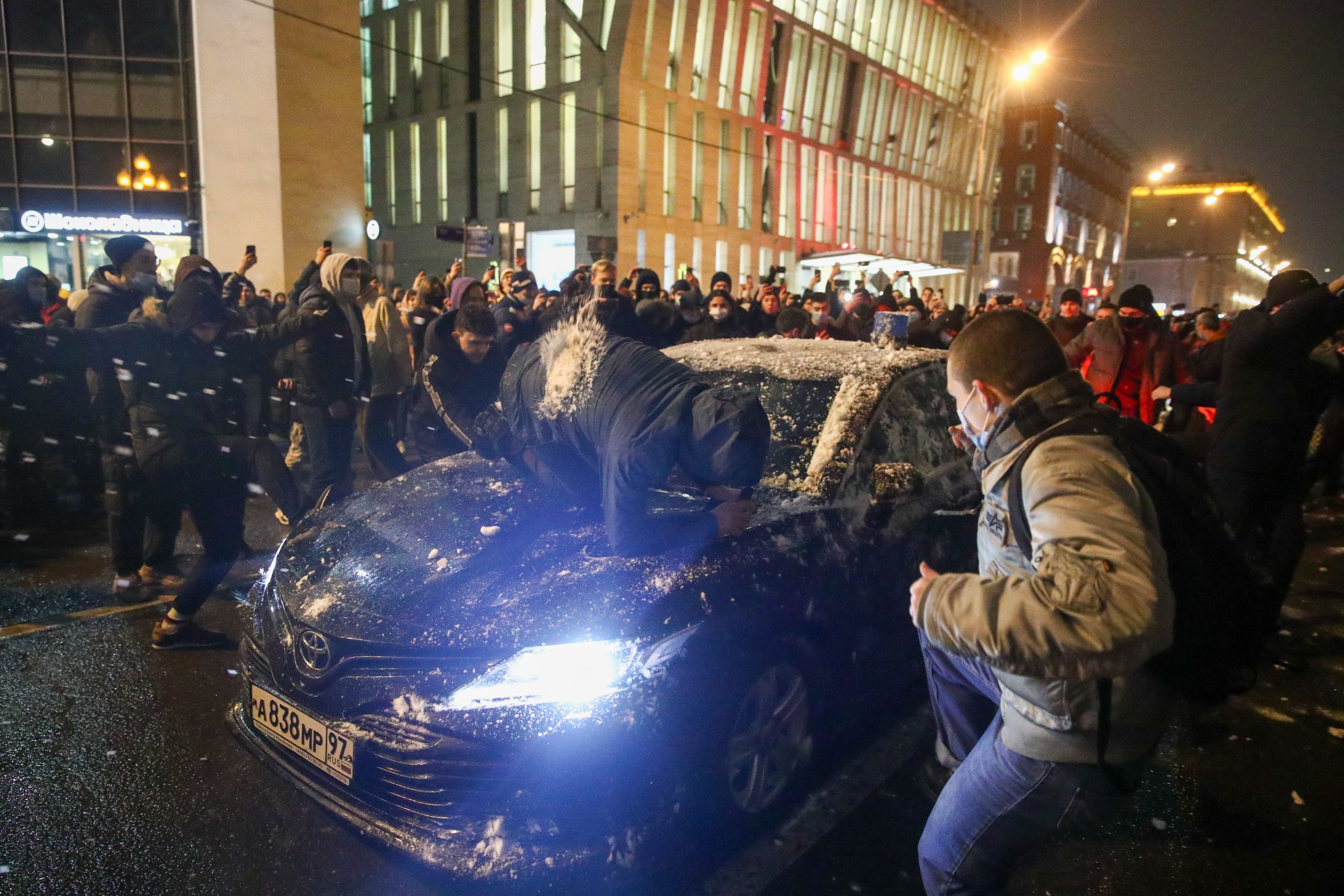 Во время акции протеста в Москве протестующие на Цветном бульваре закидали снежками автомобиль с мигалкой. Источник «РИА Новости» сообщил, что водитель автомобиля госпитализирован, ему якобы выбили глаз. ТАСС тоже со ссылкой на источник написал, что автомобиль принадлежит ФСБ и что водитель получил «травму глаза».