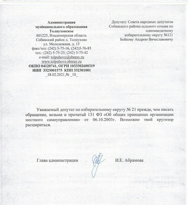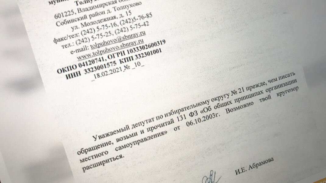 «Она со мной постоянно разговаривает в неуважительной форме, оскорбляет, общается нецензурной бранью и с жителями, и со мной. Но чтобы додуматься на официальном бланке так ответить на официальное обращение — я, конечно, не ожидал», — сказал Бойков. По его словам, он собирается написать главе Владимирской области Владимиру Сипягину с просьбой проверить высказывание Абрамовой и созвать комиссию по этике.