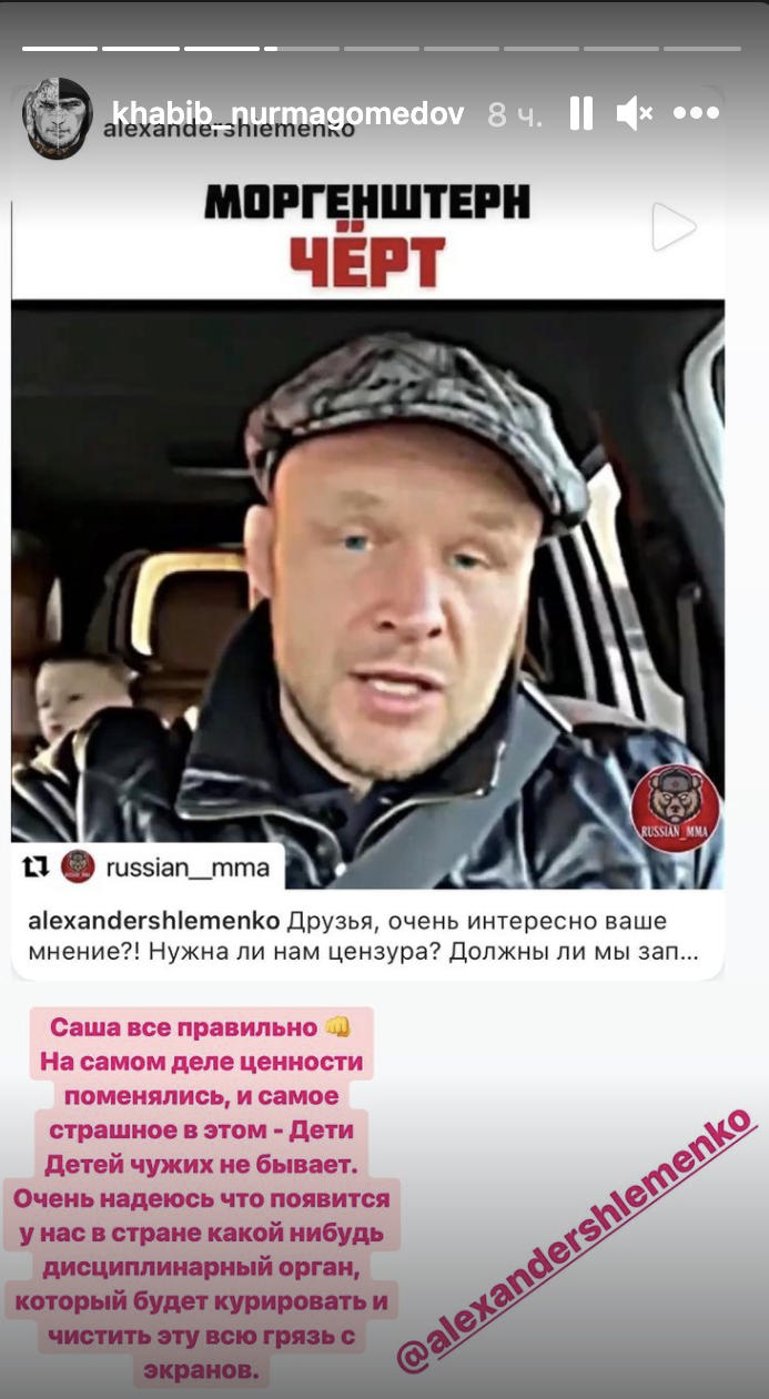 Российский боец смешанных единоборств Хабиб Нурмагомедов поддержал спортсменов, раскритиковавших рэпера Моргенштерна. Он написал об этом в «истории» в своём Instagram.
