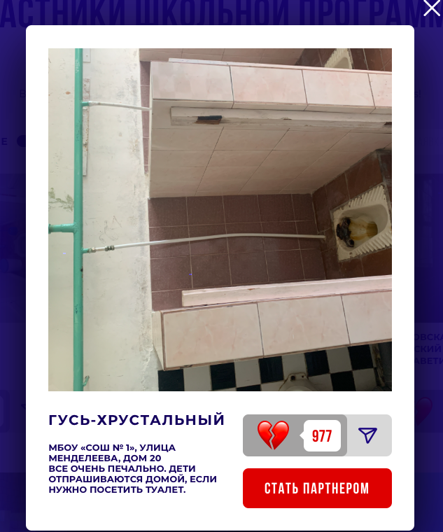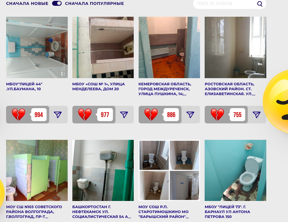 В описании к фото россияне жалуются, что ремонт в школьных туалетах не делали уже десятки лет, в санузлах нет перегородок или плитки, осыпается штукатурка на потолке. «Всё очень печально. Дети отпрашиваются домой, еси нужно посетить туалет», — пишет пользователь, опубликовавший фото туалета из СОШ № 1 в Гусь-Хрустальном (Владимирская область). «Ввод в эксплуатацию в 1971 году. За 50 лет ни разу не был капитальный ремонт санузлов. Ремонт производим своими силами», — отметил заявитель из СОШ № 6 Нефтекамска (Башкортостан).