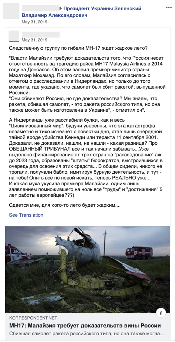 В качестве примера записи на одной из таких страниц Facebook привёл на своём сайте пост в группе под названием «Президент Украины Зеленский Владимир Александрович». В нём пользователь, имя которого скрыто, рассуждает о том, будут ли наказаны виновные в трагедии с малайзийским Boeing, потерпевшим крушение на востоке Украины.