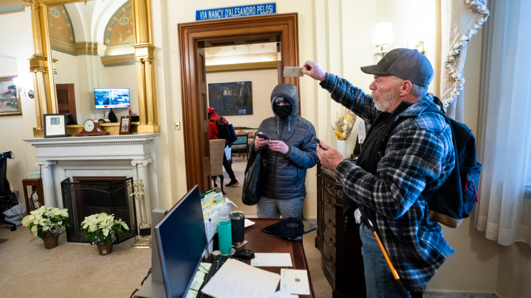 Сторонники Трампа в кабинете Нэнси Пелоси во время беспорядков в Вашингтоне. Фото: JIM LO SCALZO / EPA / TASS