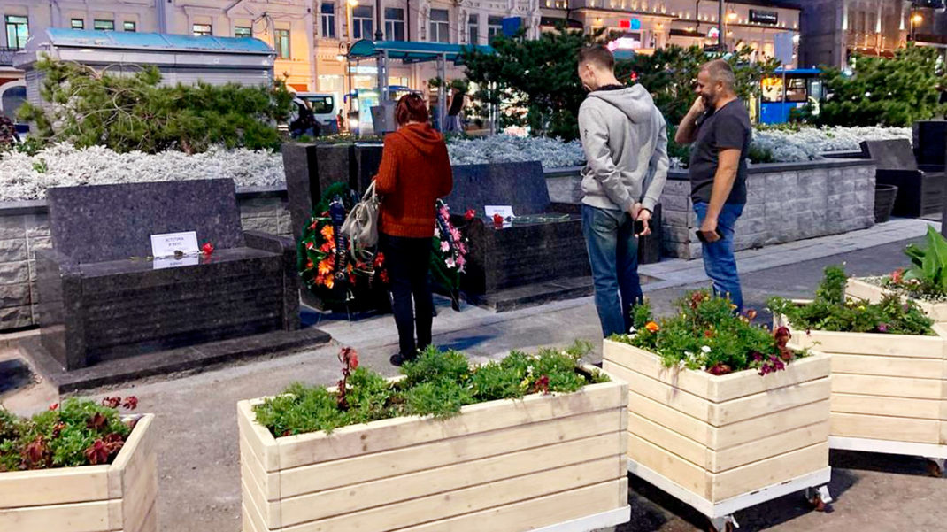Гранитные лавочки, вазоны и урны появились на центральной площади Владивостока в начале сентября. Их установили по заказу администрации города. Местным властям, подсчитали журналисты издания vl.ru, проект обошёлся более чем в 10,8 млн рублей. Чтобы привлечь внимание к проблеме, владивостокские активисты в конце сентября устроили у гранитных скамеек на центральной площади города акцию: к лавочкам они возложили траурные венки с надписями «Похороны здравого смысла и вкуса».