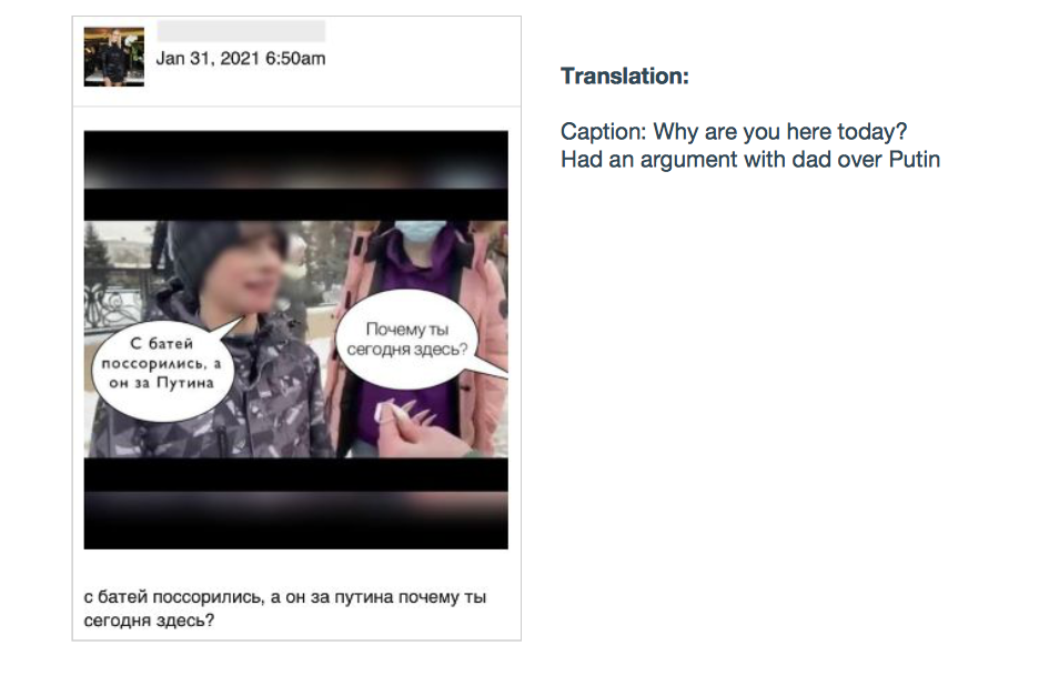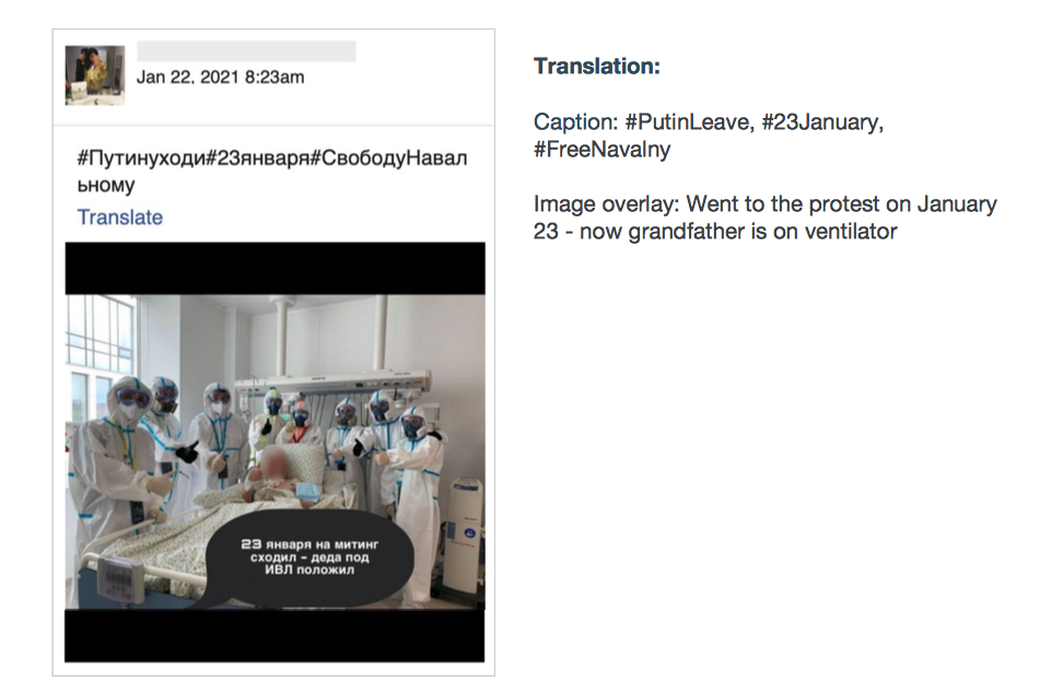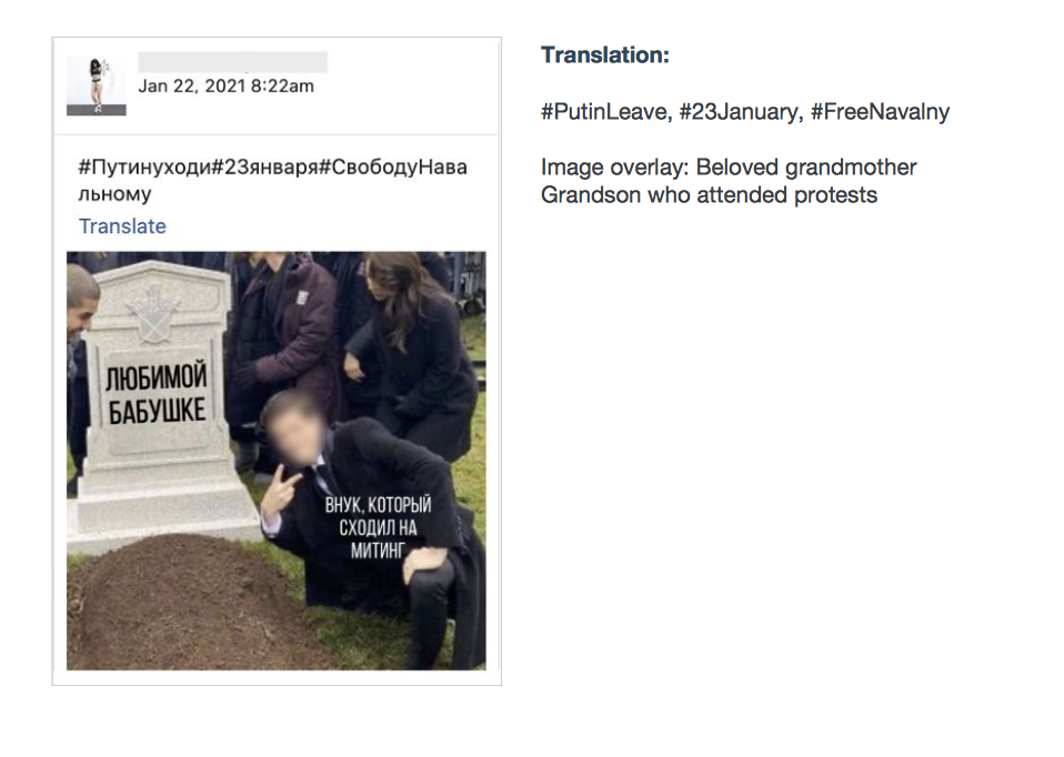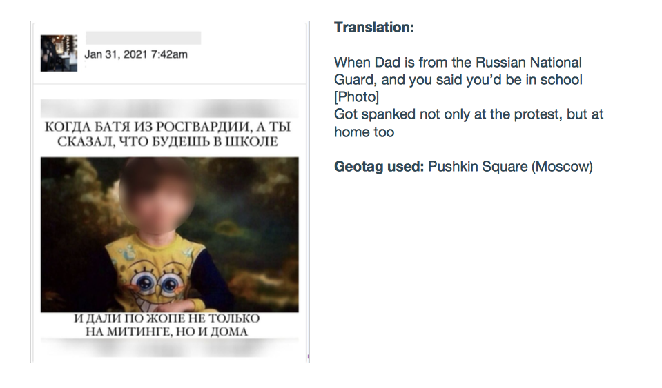 В документе приведены несколько примеров мемов, которые появлялись на этих страницах перед акциями 23 и 31 января. Среди них: картинка с улыбающимся мужчиной возле могилы «Любимой бабушке» и подписью «Внук, который сходил на митинг»; фото врачей и лежачего пациента с надписью «23 января сходил на митинг — деда под ИВЛ положил»; а также мем с недовольным мальчиком в пижаме с Губкой Бобом «Когда батя из Росгвардии, а ты сказал, что будешь в школе. Дали по жопе не только на митинге, но и дома».