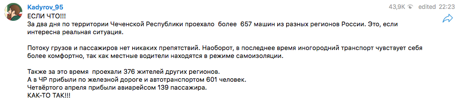 Кадыров 1 апреля объявил, что границы Чечни будут закрыты. Мишустин спустя пять дней назвал закрытие границ регионов недопустимым и отметил, что главы «некоторых субъектов не справились» со своими полномочиями. Кадыров отказался исполнять требование не закрывать границы: он заявил, что в республику не будут впускать людей, которые там не прописаны. «Негативный опыт уже есть. Завезли инфекцию, десятки заболели, одна женщина умерла», — заявил Кадыров. При этом он отметил, что в регионе «никогда не говорили о закрытии границ и не закрывали их» для проезда транзитного и грузового транспорта.