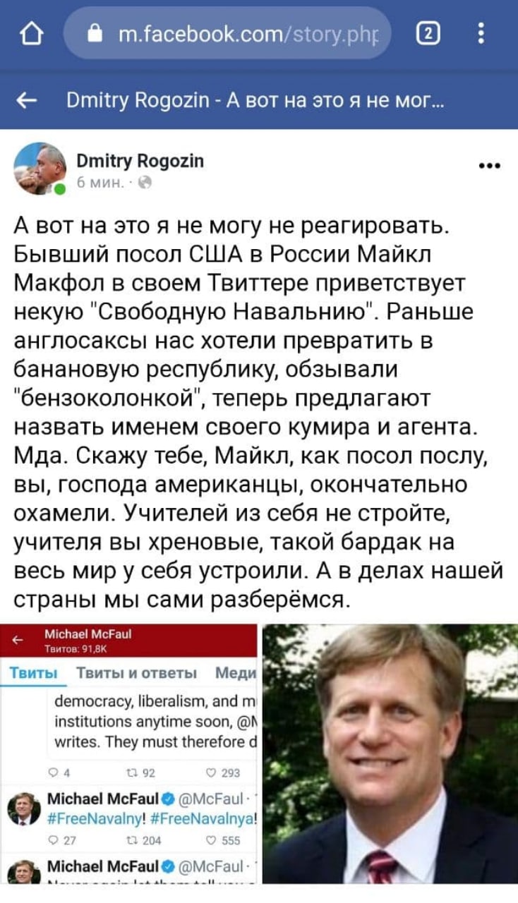 Поводом для блокировки Рогозина стали его ответы на посты бывшего посла США в России Майкла Макфола. «Что, если бы Путин позволил Навальному поучаствовать в президентских выборах? Тогда бы мы узнали [о популярности Навального]. Но Путин не хочет, чтобы мы это знали», — написал дипломат в Twitter. В другом твите Макфол призвал освободить Навального, сопроводив пост хэштегами #FreeNavalny и #FreeNavalnya (сейчас он удалён).