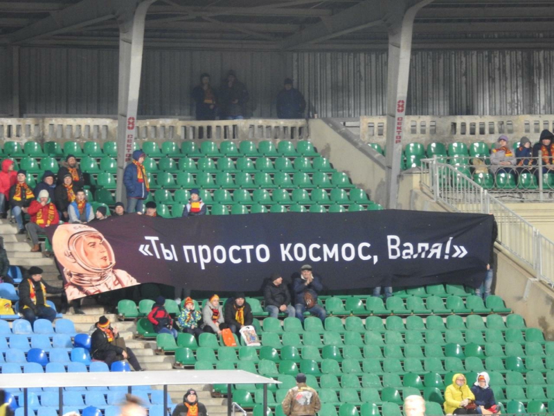 На трибуне во время футбольного матча в Туле между командами «Арсенал» и «Рубин» 14 марта растянули баннер «Валя, ты — просто космос». «Российская газета» и другие СМИ рассказали, что баннер принесли болельщики, чтобы поддержать депутата Госдумы Валентину Терешкову.