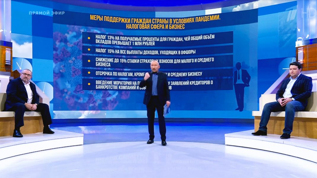 В передачах также отметили, что бизнес «нормально» воспринимает кризис, который происходит из-за пандемии, а некоторые его представители «нагнетают» ситуацию. «У них есть подушка безопасности минимум на полтора месяца», — высказал своё мнение политик Артём Кирьянов. В программе на НТВ отдельно высмеяли тех, кто недоволен налогом на вклады больше миллиона рублей: ведущий отметил, что если у россиянина есть такая сумма, то и шесть тысяч рублей на оплату налога найдутся.