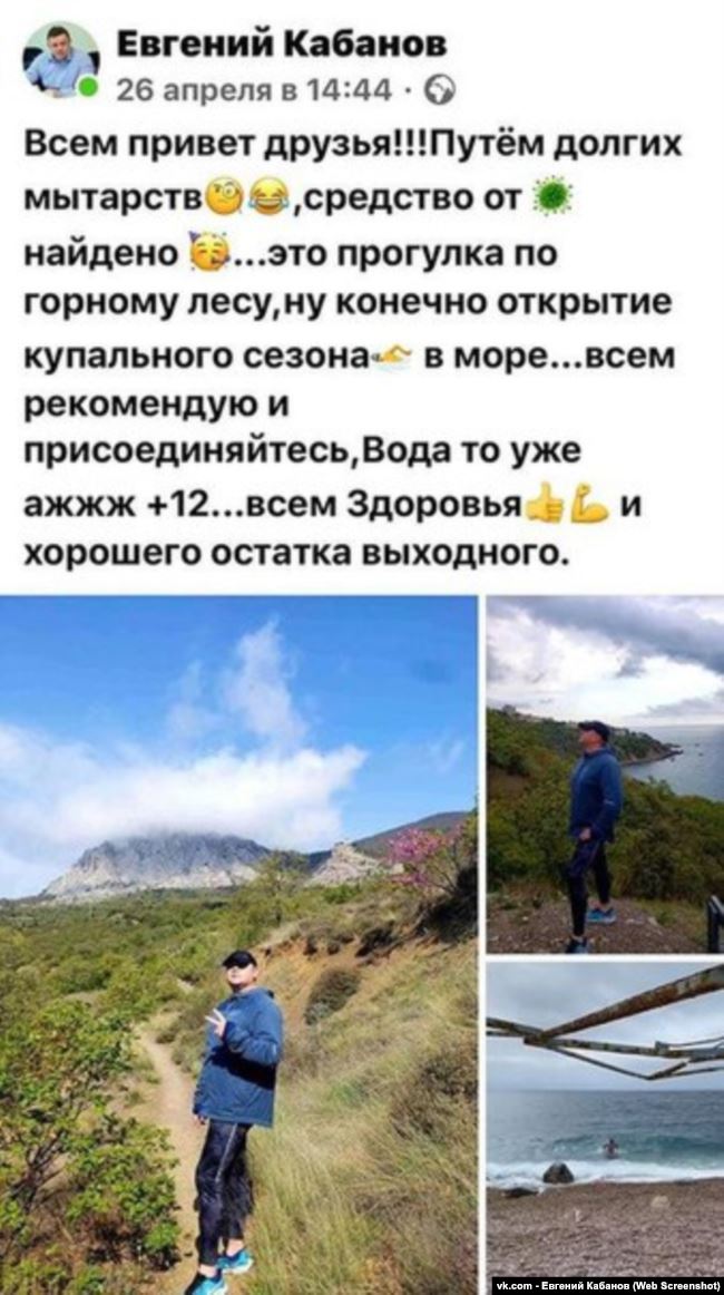 За несколько дней до извинений Кабанов опубликовал в Facebook пост о том, как прогулялся по горному лесу и искупался в море. «Всем рекомендую, и присоединяйтесь: вода-то уже аж +12. Всем здоровья и хорошего остатка выходного», — написал вице-премьер. Как пишет «Российская газета», пользователи тут же обвинили чиновника в нарушении самоизоляции и «плохом примере» для жителей. «Вместо того, чтоб личным примером убеждать земляков оставаться дома, зампред правительства демонстрирует всем неуважение закона», — написал один из них.