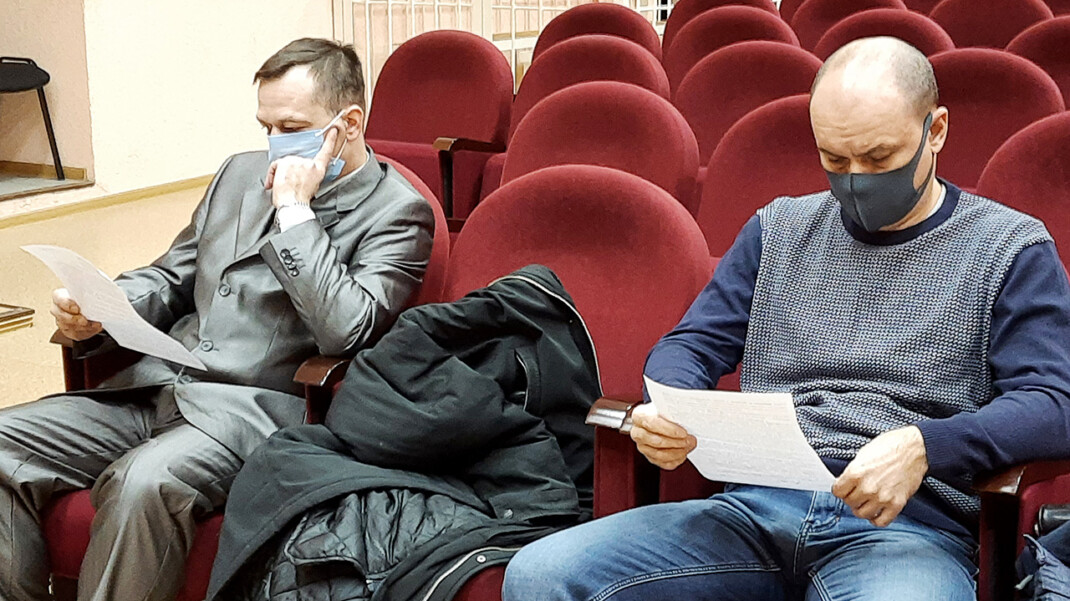 Полицейские Михаил Балашов и Дмитрий Тарицын (слева направо), обвиняемые в халатности, во время предварительного заседания в Ленинском районном суде. Фото: Пименова Мария / ТАСС