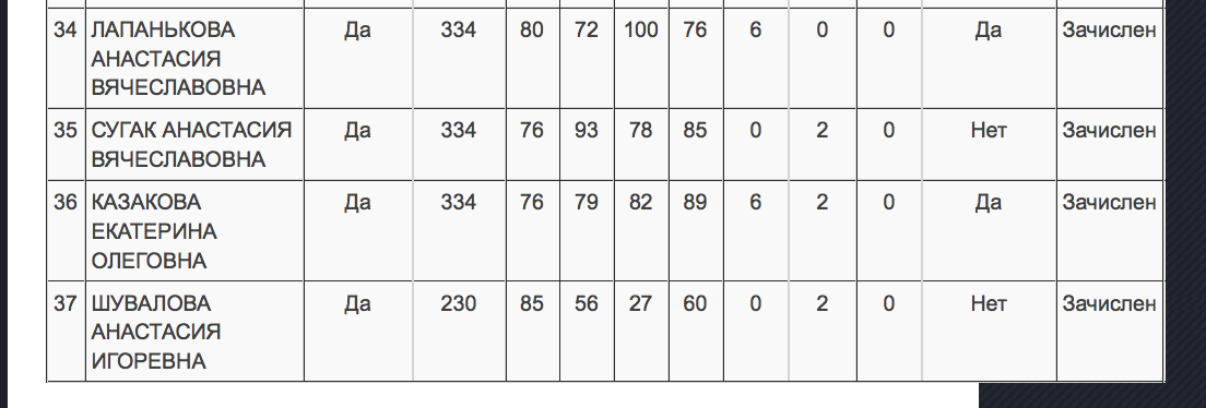 В первоначальной версии списков Шувалову зачислили на бюджет факультета психологии с 230 баллами по четырём экзаменам ЕГЭ. В 2019 году проходной бал на это направление составлял 329 баллов. Тёзка дочери в этом году занимает последнее место из 37 абитуриентов, у девушки перед ней — 334 балла. Таким образом, от другой поступившей на бюджет её отделяет больше 100 баллов.