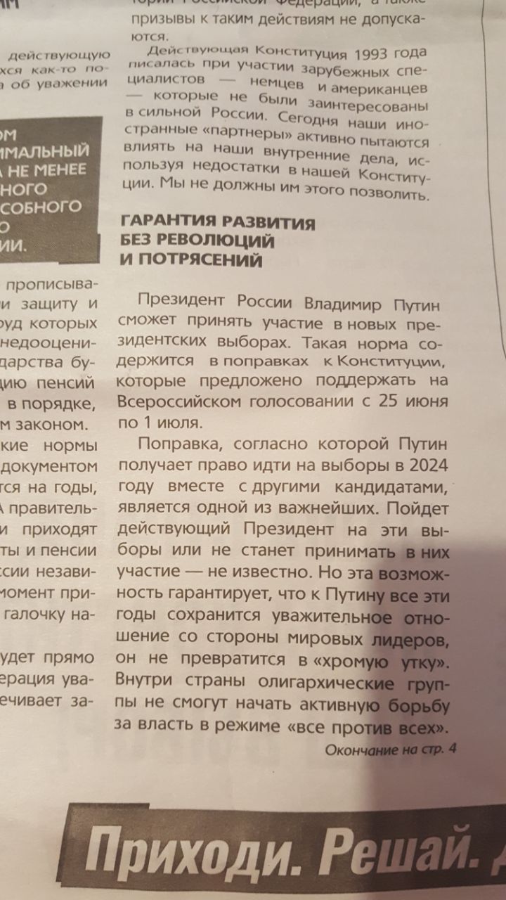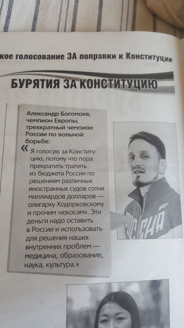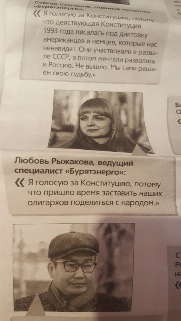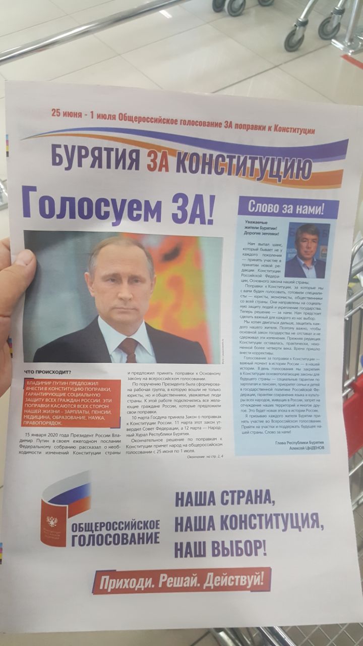 Правительство Бурятии выпустило агитационную газету с призывов голосовать «за» поправки к Конституции, позволяющие обнулить сроки президента Владимира Путина. Фотографии нескольких полос этой «листовки» выложила в своём Telegram-канале журналистка из Улан-Удэ Евгения Балтатарова.