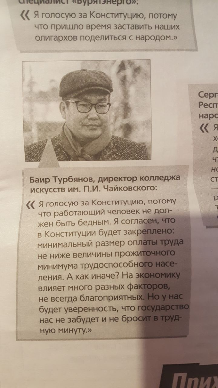На первой странице газеты размещен портрет Путина и надпись: «Голосуем ЗА!». «Нам выпал шанс, который бывает не у каждого поколения — принять участие в принятии новой редакции Конституции. <…> Прежняя редакция Конституции оставалась практически неизменной более четверти века [с 1993 года]. Пришло время внести коррективы. <…> Это будет новая эпоха в истории. Я призываю каждого жителя Бурятии прийти на участки и поддержать будущее нашей страны. Слово за нами!», — приводится заявление главы Бурятии Алексея Цыденова.