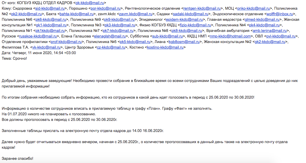 На прошлой неделе, 12 июня, врач поликлиники № 7 (она входит в структуру кировского центра) Константин Копанев рассказал «Медиазоне» и «Дождю», что отдел кадров разослал всем заведующим отделений письма с требованием обязать врачей проголосовать на плебисците по путинскому «обнулению». В нем говорилось, что начальство должно собрать всю информацию «кто из сотрудников в какой день пойдет голосовать» строго досрочно в период с 25 по 30 июня. Сам плебисцит назначен на 1 июля.