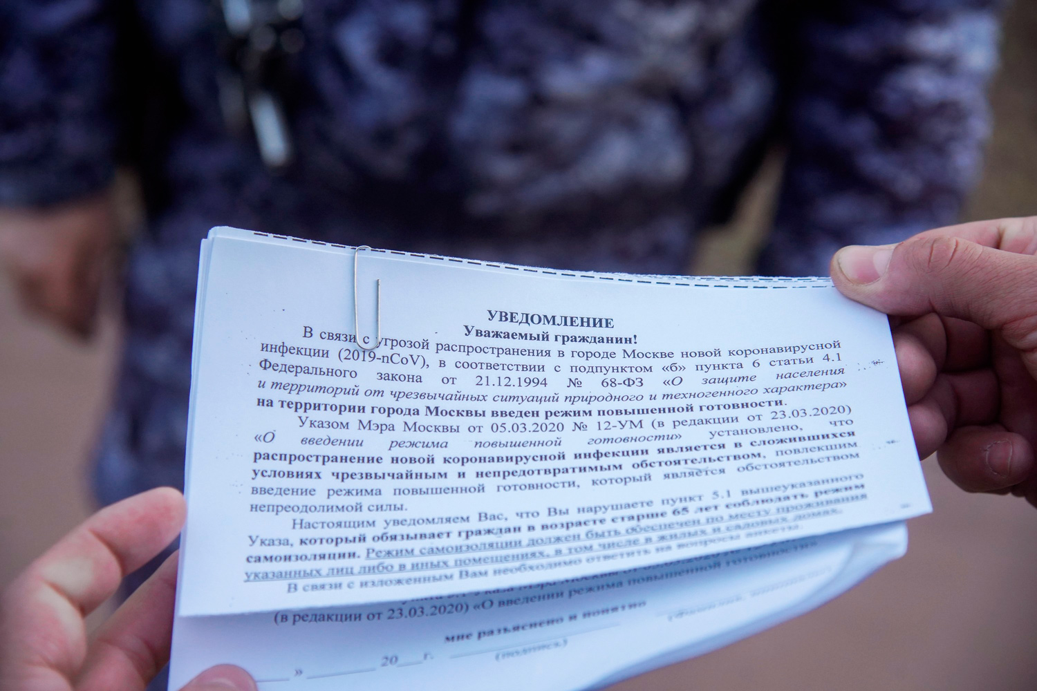 25 марта московские росгвардейцы провели акцию под названием «Оставайтесь дома», в ходе которой пожилым людям на улицах вручили памятки с разъяснениями правил карантина. Москвичей старше 65 лет мэр росгвардейцы предупреждали, что, находясь на улице, они нарушают указ мэра Москвы Сергея Собянина, который обязал пожилых людей соблюдать режим самоизоляции и не выходить на улицу без необходимости.