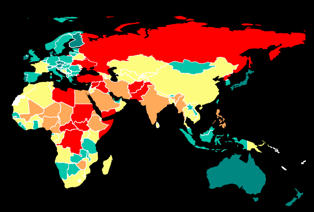 Россия оказалась ниже всех других стран Европы и бывшего СССР и соседствует, кроме Судана и ЦАР, с Пакистаном, Северной Кореей, Конго, Сомали и Йеменом.