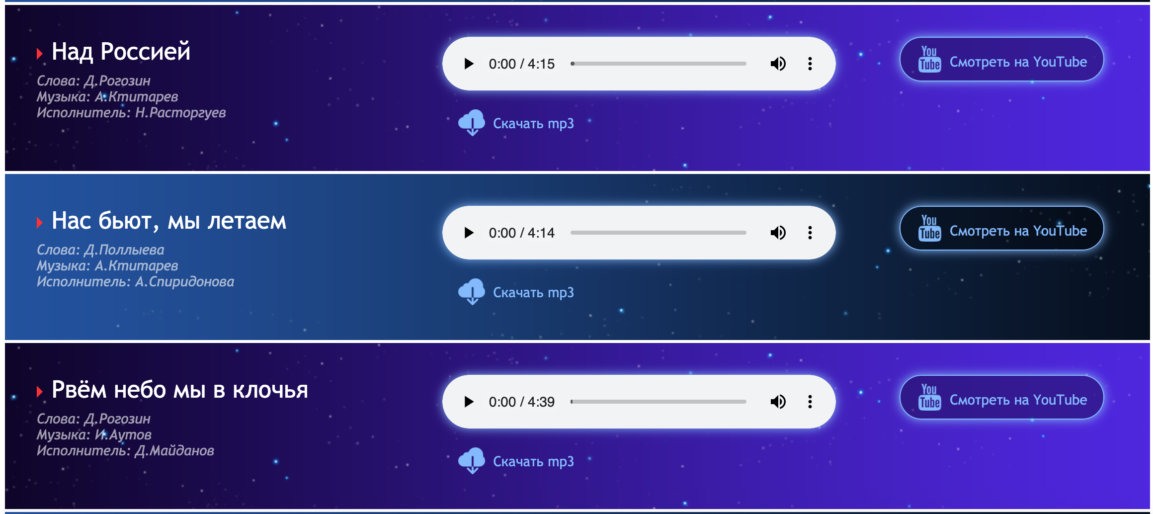 На сайте госпорпорации опубликованы 12 композиций. Для пяти из них тексты написал Рогозин, в частности для таких композиций, как «Рвём небо мы в клочья», «Над Землей летит корабль» и «Байконур». Песни исполнили несколько российских музыкантов, таких как солист группы «Любэ» Николай Расторгуев, Андрей Ктитарев, Эдвард Хачарян и Денис Майданов.