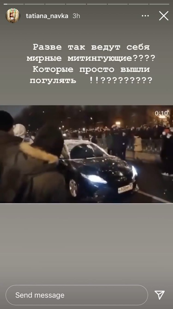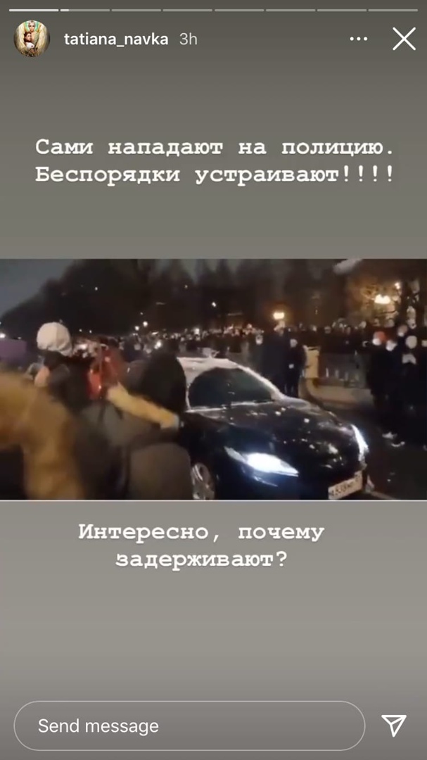 «Разве так ведут себя мирные митингующие??? Который просто вышли погулять???», — написала Навка в сторис. В качестве примера она разместила записи с акции, на которых видно, как люди закидывают снежками сотрудников ОМОНа и автомобиль с госномерами и мигалкой (позднее выяснилось, что это служебная машина ФСБ России).