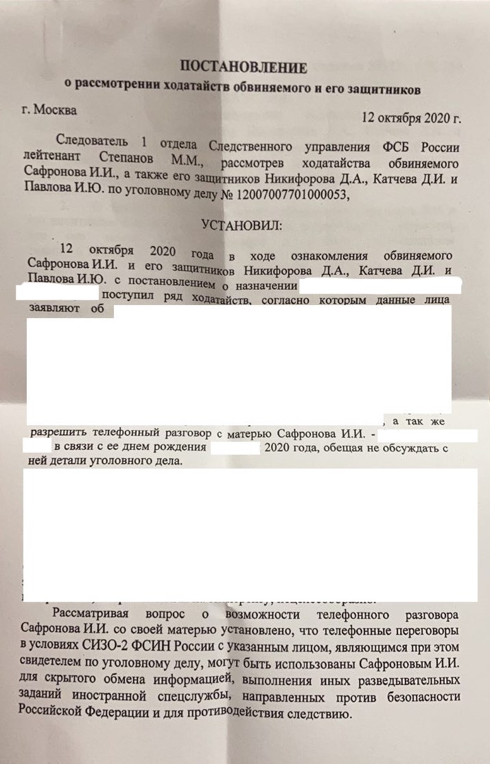 В постановлении следователя говорится, что разговор Сафронова с матерью (свидетелем по уголовному делу) может быть использован «для скрытого обмена информацией и выполнения иных заданий иностранной спецслужбы», направленных против национальной безопасности России.