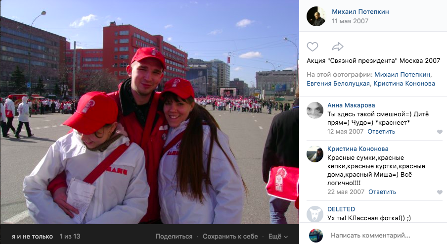 - Россиянин Михаил Потёпкин (связан с внесенными в список «М-Инвест» и Meroe Gold Cо Ltd). «Открытые медиа» выяснили, что ещё в 2000-х он работал на Кремль — был комиссаром прокремлёвского движения «Наши» в Санкт-Петербурге. На фото — Потёпкин проводит акцию «Связной президента» в мае 2007 года в Москве. До работы в «М-Инвест» Потёпкин сотрудничал с «Агентством интернет-расследований», которое в СМИ получило название «фабрика троллей», указывает американской Минфин.