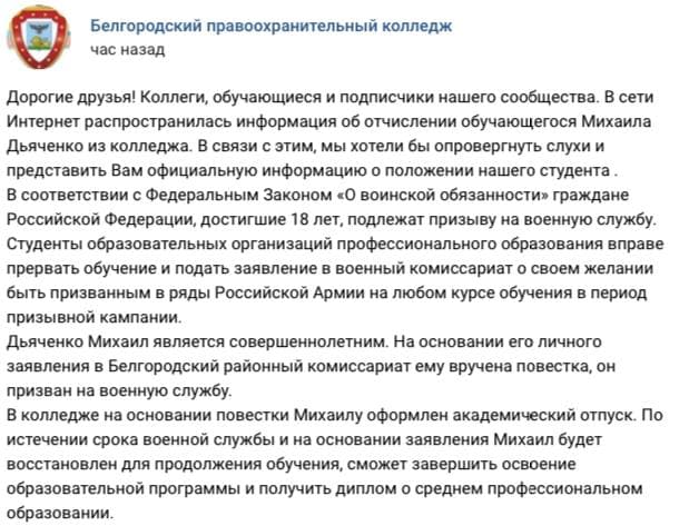 В официальной группе колледжа во «ВКонтакте» 27 апреля появился пост, в котором говорилось, что Дьяченко отправили в академический отпуск на основании повестки из военкомата, в который он обратился лично. Спустя несколько часов сообщение удалили.