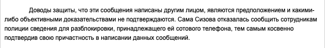 Суд признал женщину виновной ворганизации митинга вподдержку Навального 23 января (ч. 2 ст. 20.2 КоАП). Врешении говорится, что пользовательница Telegram сником «Татьяна Сизова» написала вчате «Чат штаба Навального вБелгороде» место ивремя акции. Когда силовики попросили унеё пароль отсмартфона, чтобы проверить, действительноли она писала это сообщение, Сизова вответ имотказала.Скриншот: сайт Октябрьского районного суда Белгорода«Сизова отказала сообщить сотрудникам полиции сведения для разблокировки принадлежащего ейсотового телефона, тем самым косвенно подтвердив свою причастность внаписании данных сообщений»,—отмечается впостановлении суда. При этом подействующему закону граждане необязаны показывать содержимое телефонов полицейским.