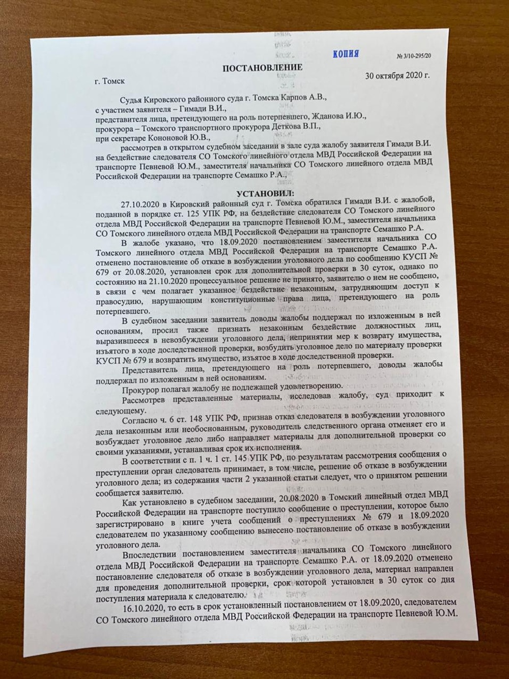 Вместо имени в решении используется выражение «лицо, претендующее на роль потерпевшего». В то же время в документе указаны фамилии других представителей ФБК: юристов Вячеслава Гимади и Ивана Жданова, которые представляют интересы Навального.