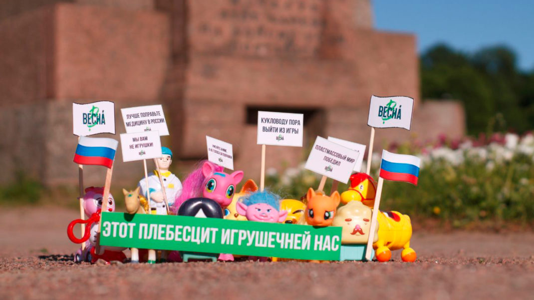«Игрушки выразили недовольство грядущим голосованием. Потом по всему центру состоялись пикеты», — отмечали активисты. На фото «Весны» куклы держат в руках плакаты с надписями: «Поправки нас не защитят», «Лучше поправьте медицину в России», «Этот плебесцит игрушечней нас», «Кукловоду пора выйти из игры», «Против» и другими.