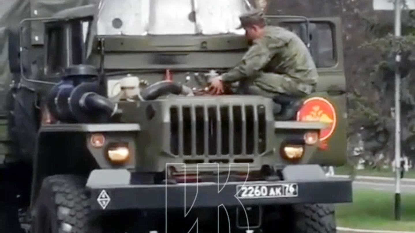 На кадрах — стоит колонна военной техники, и из моторного отдела одной из машин вырывается пламя. Сбить огонь водителю автомобиля удалось самостоятельно — сначала он попытался сделать это с помощью огнетушителя, но тот не сработал; после этого мужчина достал из салона машины тряпку и ликвидировал возгорание.
