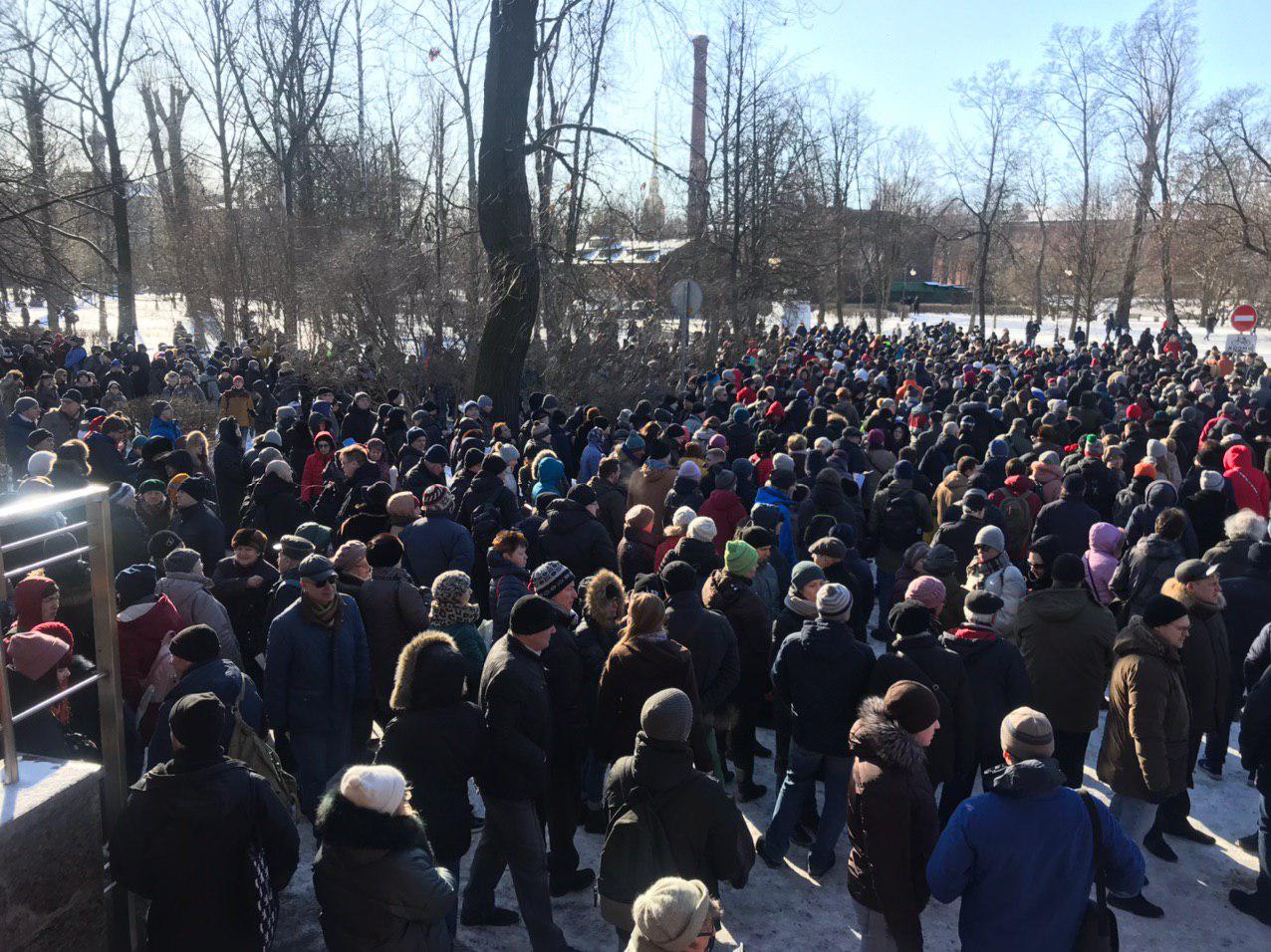 - На 12:15 мск к месту сбора, по оценкам корреспондента «Открытых медиа», пришли уже более 500 человек, люди продолжали подходить. Местное издание «Фонтанка» со ссылкой на организаторов писало о тысяче собравшихся, позже эти данные подтвердил и корреспондент «Открытых медиа».