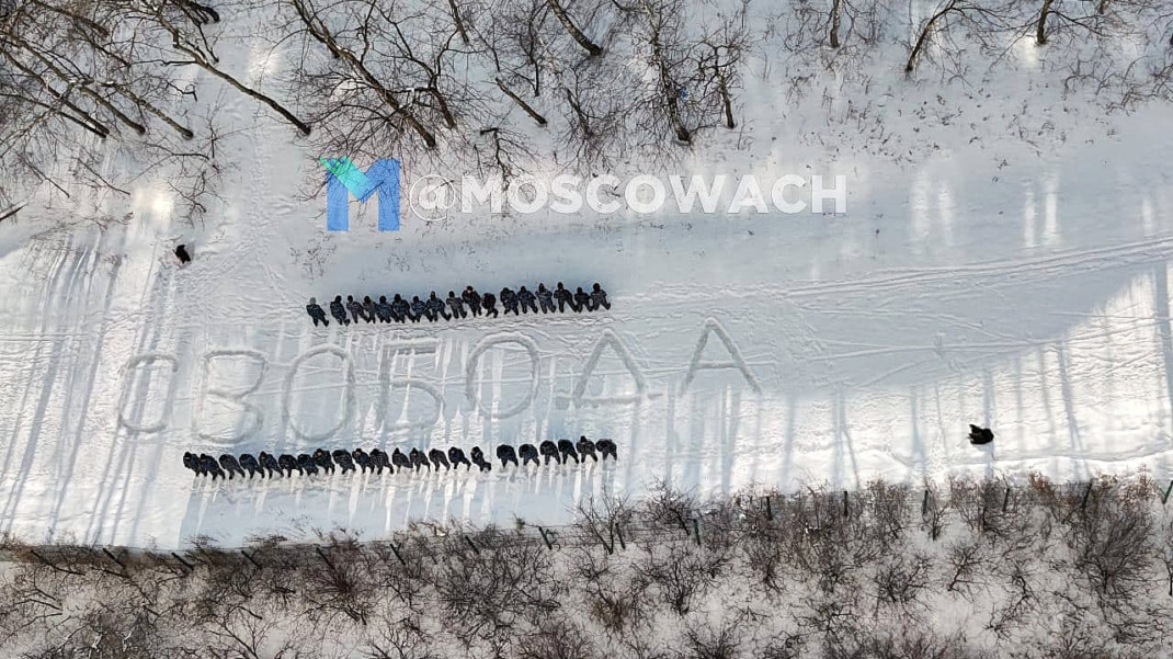 В Москве задержали участников перформанса, которые, «переодевшись в омоновцев», выстроились вокруг написанного на снегу слова «свобода» — будто взяли его в оцепление, сообщает Telegram-канал «Москвач».