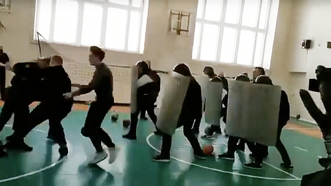 Местный телеканал «Метрополис» опубликовал видеозапись «сценки» в спортзале школы. На кадрах видно, как силы «ОМОНа» со щитами и дубинками выстраиваются в шеренгу, после чего «протестующие» начинают закидывать их мячами. Одного человека «задерживают».