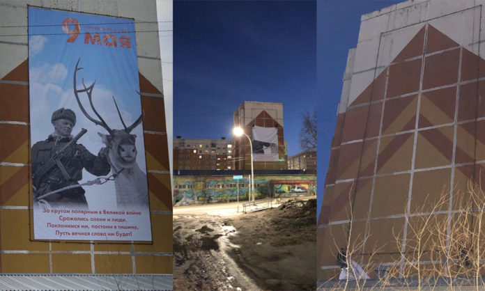 На этой неделе, 4 мая, власти Усинска (республика Коми) в предверии Дня Победы повесили на торец одного из многоэтажных домов плакат с оленем и военным, сопроводив его подписью: «За кругом Полярным в Великой войне сражались олени и люди. Поклонимся им, постоим в тишине, пусть вечная слава им будет!». Пользователи соцсетей обратили внимание на то, что на баннере изображен не советский, а финский солдат (в годы блокады Ленинграда Финляндия воевала на стороне Германии — ОМ).