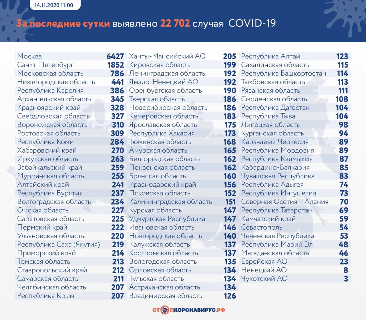 — За сутки выявили 22 702 случаев COVID-19, 6427 из которых — в Москве, 1852 — в Петербурге, 786 — в Московской области и 441 — в Нижегородской области.