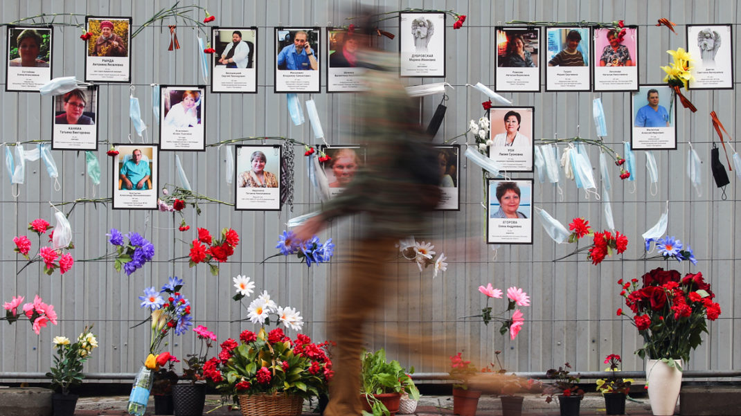 Стена памяти с фотографиями медиков, умерших после заражения коронавирусом. Фото: Петр Ковалев / ТАСС