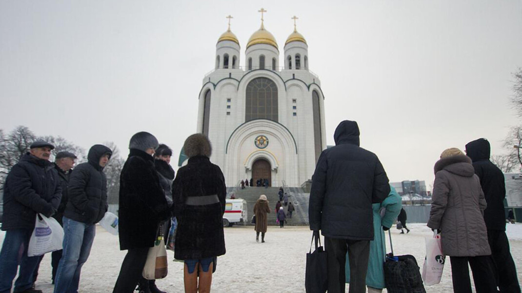 Раздача освященной воды в калининградском храме Христа Спасителя. Фото: Подгорчук Александр / «Коммерсантъ»
