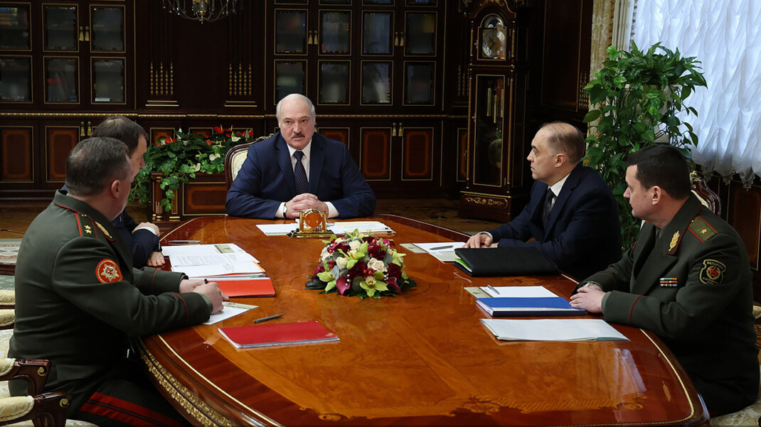 Александр Лукашенко (в центре) на совещании по вопросу белорусско-российского сотрудничества в военной сфере. Фото: скриншот / президент Республики Беларусь / president.gov.by