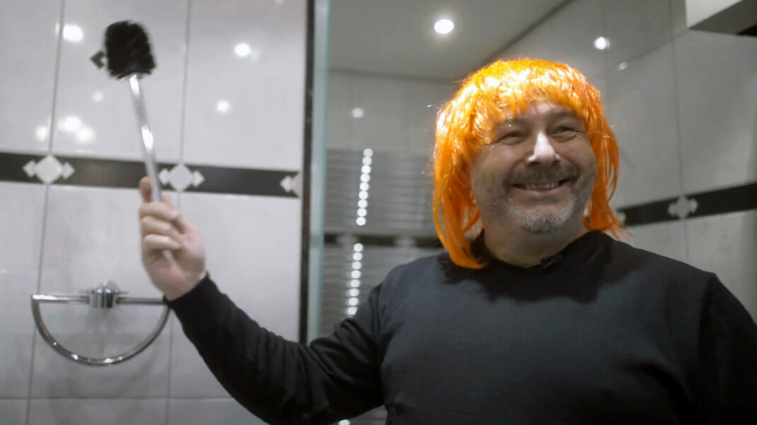 Пародируя журналистку ВГТРК Анастасию Попову, мужчина надел оранжевый парик и прогулялся по вилле. На видео он каждый раз «удивляется» элементам интерьера дома: вазе с фруктами, кухне, унитазу и туалетному ёршику в ванной. Последним он попытался «почистить» зубы. Мужчина также поплавал в бассейне.